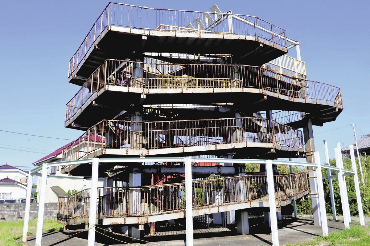 「危険ですので立ち入らないでください」――。今泉海水浴場から直線で約400メートル、徒歩7分ほどの場所にある津波避難タワーには赤文字で注意を促す看板が置かれ、周辺はロープで封鎖されていた。柱や手すりはさびつき、タワーの下には鉄*が散らばっていた。